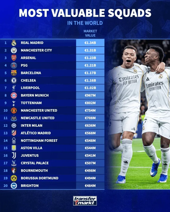 足坛俱乐部身价Top20:皇马13.4亿欧居首,曼城、阿森纳前三